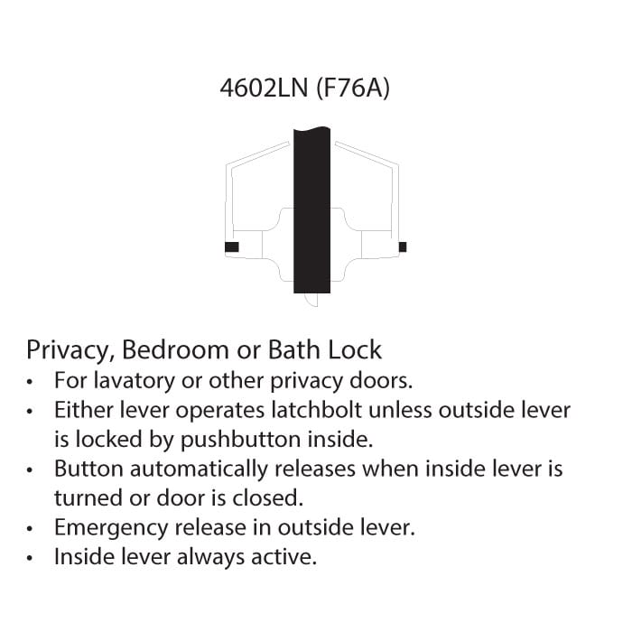 ANSI Function F76 – Keyless – Push-button locking; Can be unlocked from outside with small screwdriver; Turn inside lever or close door to release button – Inside lever always free for immediate egress