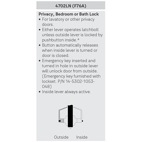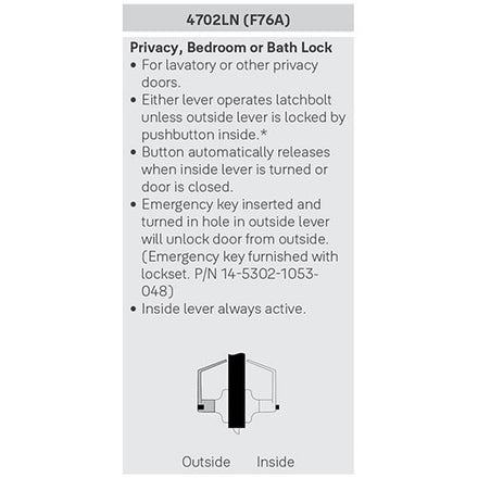 ANSI Function F76 - Keyless - Push-button locking; Can be unlocked from outside with small screwdriver; Turn inside lever or close door to release button - Inside lever always free for immediate egress