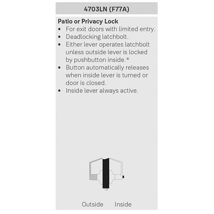 ANSI Function F77A - For exit doors with limited entry. Deadlocking latchbolt. Either lever operates latchbolt unless outside lever is locked by pushbutton inside. Button automatically releases