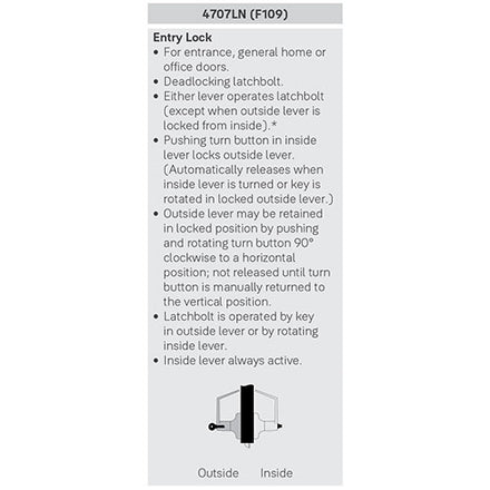 ANSI Function F109 - Turn/Push button locking. Pushing and turning button locks outside lever requiring use of key until button is manually unlocked. Pushing button locks outside lever until unlocked with key or inside lever is turned.