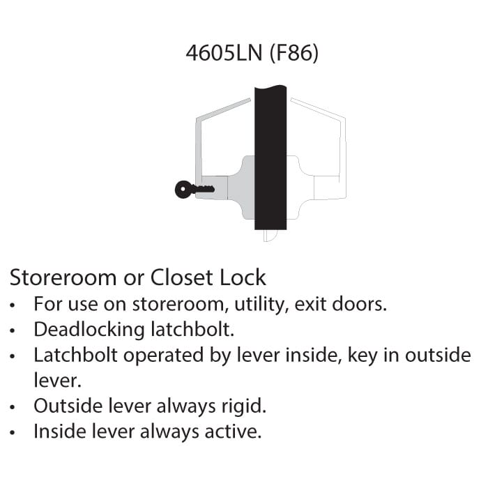 ANSI Function F86 - Deadlocking latch bolt by lever inside or key outside. Outside lever is always locked. Inside lever is always free.