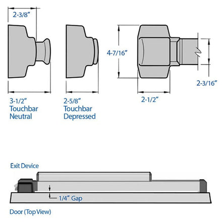 - Touchbar Clearance – Can accommodate doors with vision lites or where the lite frames or moldings project up to 1/4 beyond the face of the door