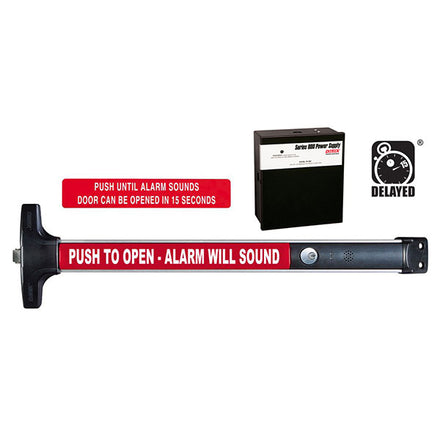 The EE, designed for primary and secondary exits, provides a secure 15-second delay and a 100 decibel alarm when someone attempts to exit. This 15-second delay allows management time to respond before someone exits and the alarm deters the exit from occurring. Per life safety requirements, the EE must be provided with a fire alarm input, thus providing a system override during a fire emergency. The EE provides security while meeting all life safety concerns, offering an exceptional value.