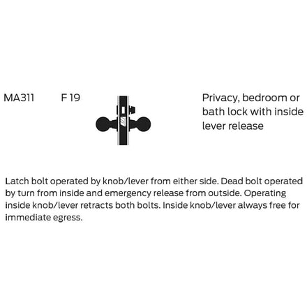 ANSI F19 - Privacy, Bedroom, Bath Mortise Lock - Latch bolt operated by knob/lever from either side. Dead bolt operated by turn from inside and emergency release from outside. Operating inside knob/lever retracts both bolts. Inside knob/lever always free for immediate egress.