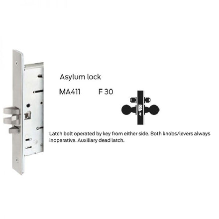 ANSI F30 - Asylum: Latch bolt operated by key from either side. Both knobs/levers always inoperative. Auxiliary dead latch.