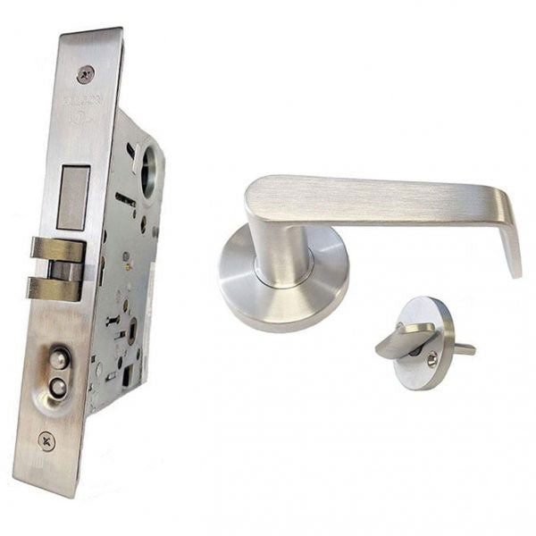 ANSI F08/F10 - Apartment corridor lock with button lockout: Latch bolt is operated by knob/lever from either side, except when outside knob/lever is made inoperative by buttons in face. Dead bolt is operated by turn inside. Key outside operates both bolts. Outside knob/lever is unlocked by button on face. Inside knob/lever always free for immediate egress.