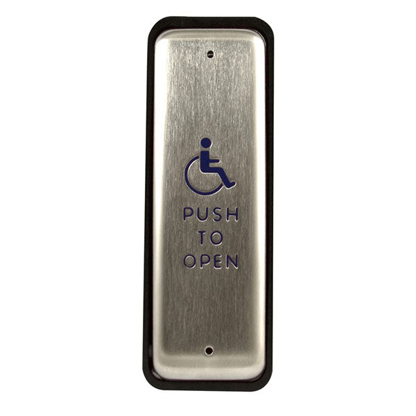 - 1 1⁄2" (38mm) wide by 4 3⁄4" (121mm) Engraved blue filled handicap symbol and “Push to Open”