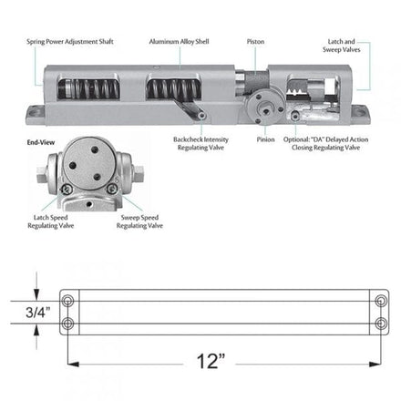 This arm incorporates a stop at the arm’s soffit plate to dead stop the door at a predetermined degree of door swing between 85° to 110°, in 5° increments. Prior to dead stop the door closer’s backcheck feature slows the door speed to reduce the impact of the stop action. The CloserPlus Arm is intended for use where an auxiliary door stop cannot be utilized and no more than moderate abuse is anticipated. Where more extreme conditions are expected, use of a Unitrol arm is recommended.