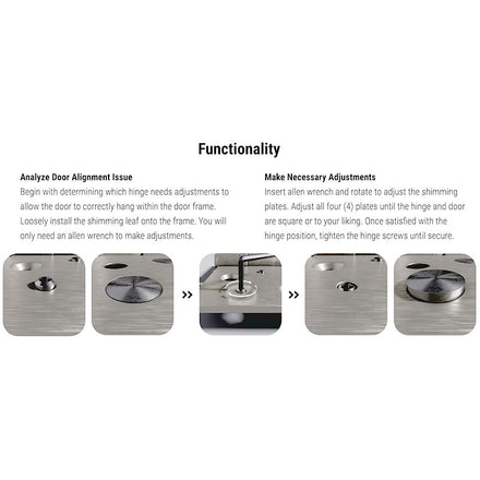 After years of research and testing, PBB has the solution for shimming/squaring doors. The method only requires a quick turn of an Allen wrench, allowing you to shim the hinge instantly. The shim hinge saves time and money from conventional shimming methods.