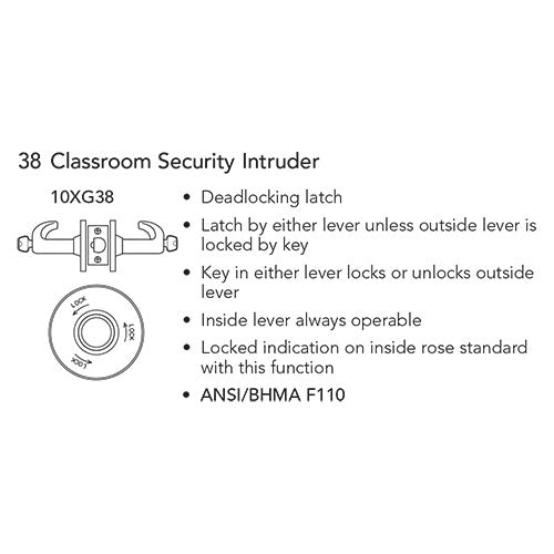 Sargent 10XG38 Grade-1 Cylindrical Lock, Classroom Security Intruder Function, L Lever, L Rose