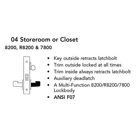 ANSI F07 – Storeroom or Closet – Key outside retracts latchbolt. Trim outside locked at all times. Trim inside always retracts latchbolt. Auxiliary deadlatch.