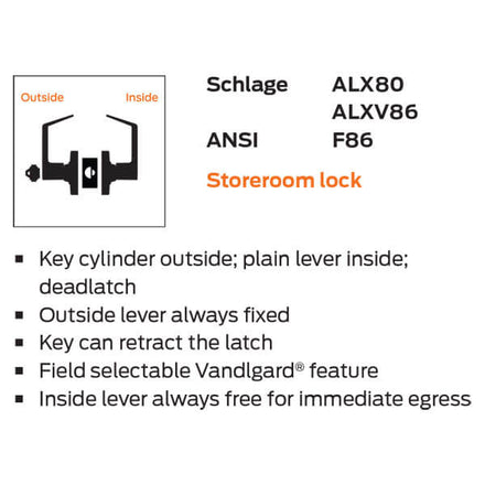 ANSI Function F86 – Key cylinder outside; plain lever inside; deadlatch. Outside lever always fixed. Key can retract the latch. Inside lever always free for immediate egress.