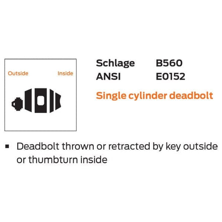 Schlage B560FP Grade 2 Single Cylinder Deadbolt, Conventional Cylinder, Schlage C Keyway, Adjustable 2-3/8" and 2-3/4" Backset, UL Listed for 3 Hour Fire Doors