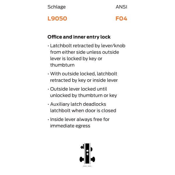 ANSI F04 - Office/Entry - Latchbolt retracted by lever from either side unless outside is made inoperative by key outside or by turning inside thumbturn. When outside is locked, latchbolt is retracted by key outside or by lever inside. Outside lever remains locked until thumbturn is returned to vertical or unlocked by key. Auxiliary latch deadlocks latchbolt when door is closed. Inside liner is always free for immediate egress.