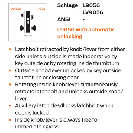 L9056 = L9050 with automatic unlocking – Latchbolt retracted by knob/lever from either side unless outside is made inoperative by key outside or by rotating inside thumbturn. Outside knob/lever unlocked by key outside, thumbturn or closing door. Rotating inside knob/lever simultaneously retracts latchbolt and unlocks outside knob/lever. Auxiliary latch deadlocks latchbolt when door is locked. Inside knob/lever is always free for immediate egress.