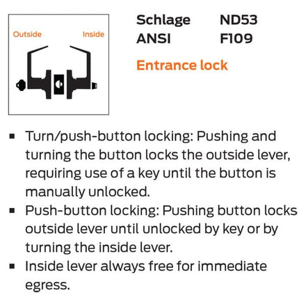 The ND Series is ANSI/BHMA Grade 1 certified and performs beyond the Grade 1 standards. The Schlage ND is regularly used in healthcare, education, government, office, retail, and other commercial applications.