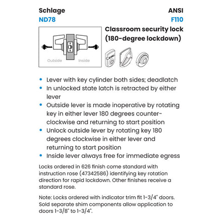 Schlage ND78PD RHO (Rhodes) Grade-1 Classroom Security Lever Lock (180 degree key rotation for lockdown) with IS-CRS (LOCKED/UNLOCKED) Inside Indicator Escutcheon Trim