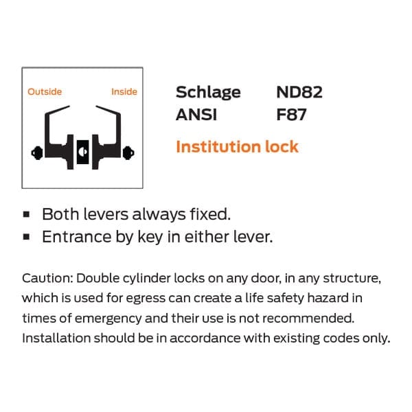 Regarded as one of the world's strongest cylindrical locksets, ND Series locks have been the most popular Schlage product ever since Walter Schlage invented the cylindrical lock in 1920. The ND Series is ANSI/BHMA Grade 1 certified and performs beyond the Grade 1 standards. The Schlage ND is extremely versatile and is regularly used in healthcare, education, government, office, retail, and other commercial applications. Because the ND uses an ANSI 161 door prep, commonly used across cylindrical locks, it is ideal for both new construction and retrofit applications.