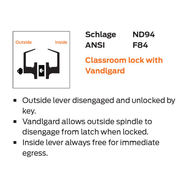 ANSI Function F84 - Outside lever disengaged and unlocked by key. Vandlgard allows outside spindle to disengage from latch when locked. Inside lever always free for immediate egress.