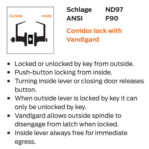 ANSI Function F90 - Locked or unlocked by key from outside. Push-button locking from inside. Turning inside lever or closing door releases button. When outside lever is locked by key it can only be unlocked by key. Vandlgard allows outside spindle to disengage from latch when locked. Inside lever always free for immediate egress.