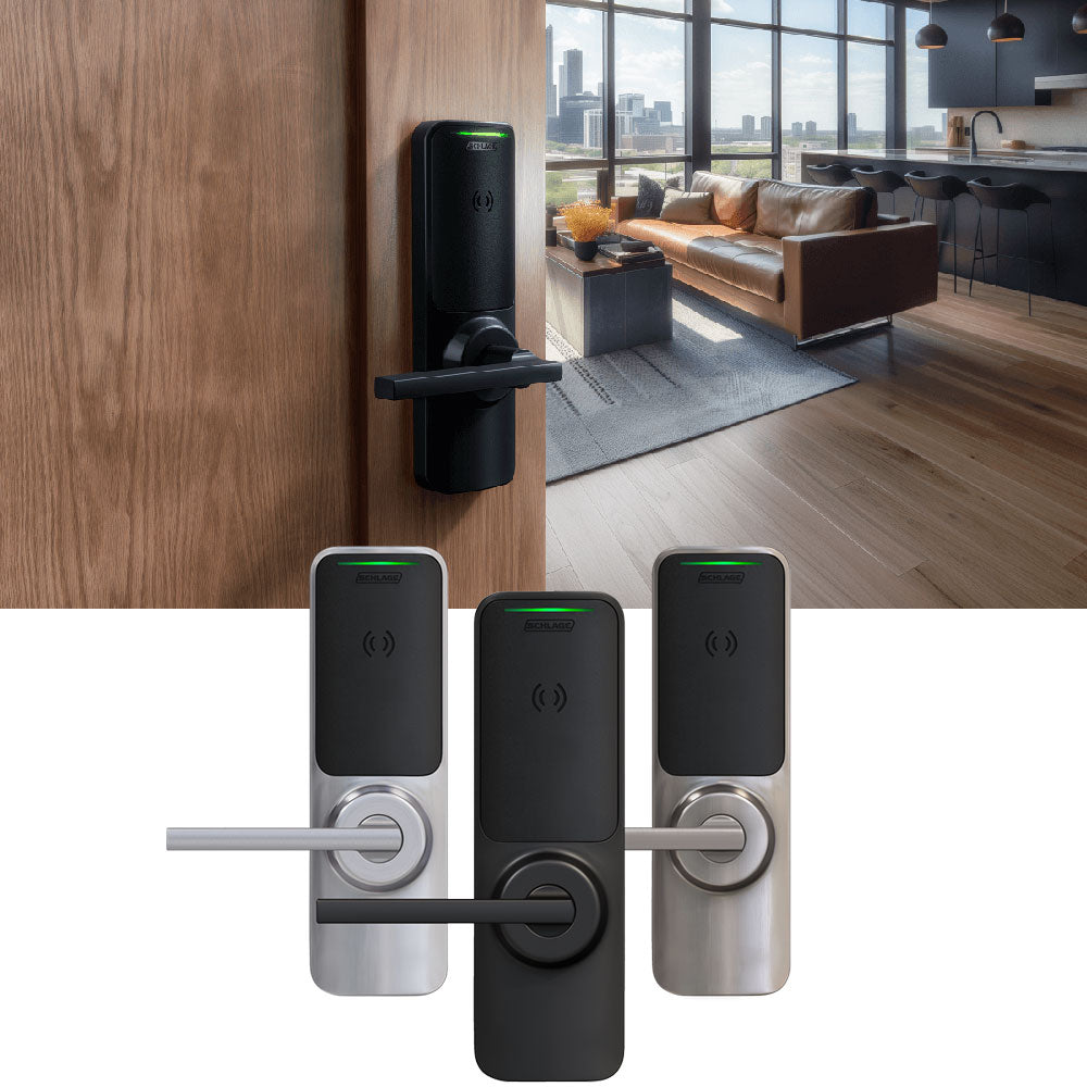 - Credential support includes Schlage MIFARE®, Bluetooth® and NFC mobile1