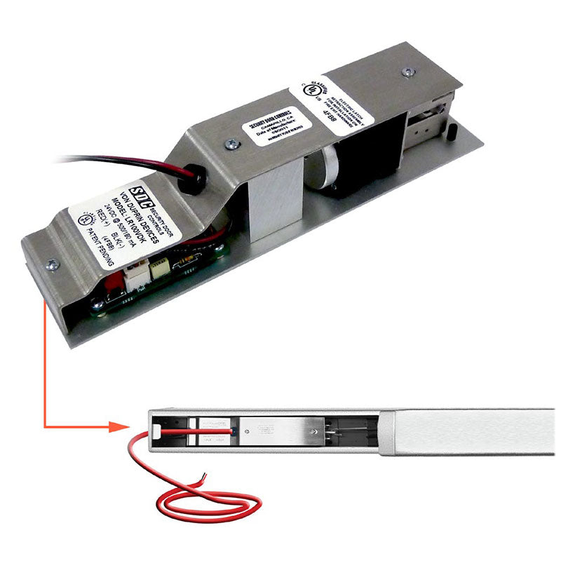 The patented design was the first retrofit motorized electric latch retraction kit brought to market and has been recognized as the market leader ever since. The use of a motorized electric latch retraction device provides several advantages over solenoids including lower current draw, quieter operation and greater durability over time. Designed with cost savings in mind, SDC’s LR100 series retrofit ELR kits not only eliminate the need for costly replacements of existing exit devices, but also provide cost savings on installation and power requirements due to significantly less labor time and current draw when compared to competitive retrofit kits. LR100 kits retrofit select exit device brands without removing the device from the door.