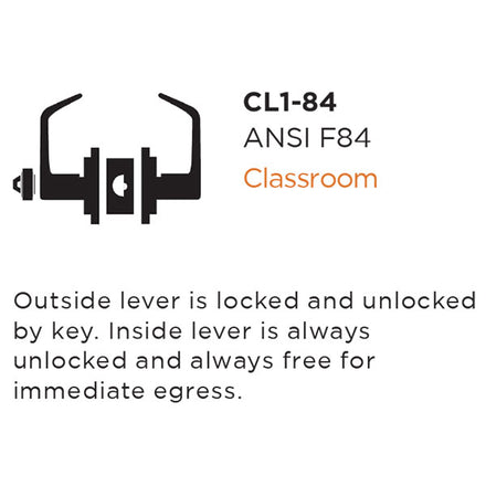 Classroom Function, ANSI F84 – Outside lever is locked and unlocked by key. Inside lever is always unlocked and always free for immediate egress.