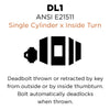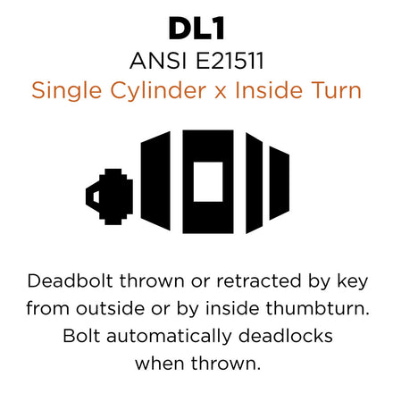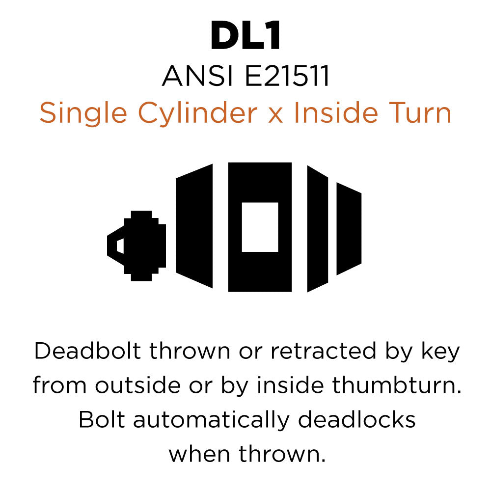- ANSI E21511 - Deadbolt thrown or retracted by key from outside or by inside thumbturn. Bolt automatically deadlocks when thrown.