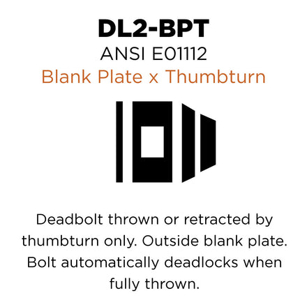 ANSI Function E01112: Deadbolt thrown or retracted by thumbturn only. Outside blank plate. Bolt automatically deadlocks when fully thrown.
